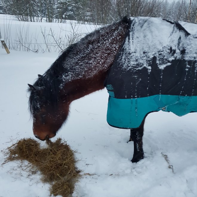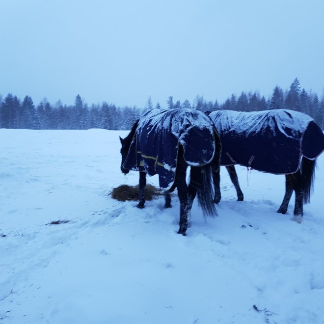 Det var bara till att pulsa omkring i snöyran på morgonen för att se till att alla hästar fick ordentligt med mat och vatten. Och vara tacksam för förberedelserna – täcken på. Alla hästar fick för säkerhets skull också vara inne en stund igår för att vara starka och pigga för utevistelse i snöväder.