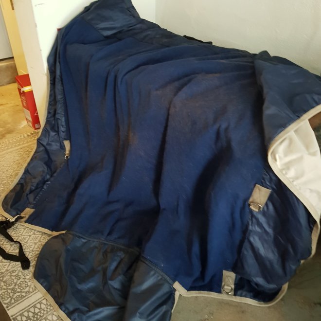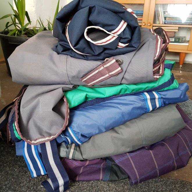 Men nu var det verkligen dags för täckena att gås igenom och få sig en rejäl tvätt och impregnering. Skitiga täcken är än värre för hästarna då de blir tunga, stela och obekväma. En del spännen hade gått också. Jag undrar varför man måste göra så dåliga spännen nuförtiden – de där snabbstpännena fram är jättebra tills de går sönder -vilket de gör typ jämt här i mitt stall i alla fall. Annat var det förr! (jag vet att jag låter som en gammal surkärring – bjuder på det! :-D) ) Vissa av mina täcken är över tjugo år gamla. Det är lite coolt faktiskt att de kan hålla så länge.